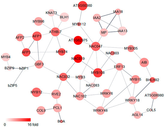 To understand the relationships between the osmotic-stress-responsive transcription factors in the roots, a protein network including all 68 transcription factors was mapped using Cytoscape STRING Apps. This analysis showed that 45 transcription factors were tightly connected and interacted with each other. Notably, NAC- and MYB-family proteins, such as NAC032, NAC083, NAC102, MYB3, and MYB108, interacted with multiple transcription factors (Figure 3).