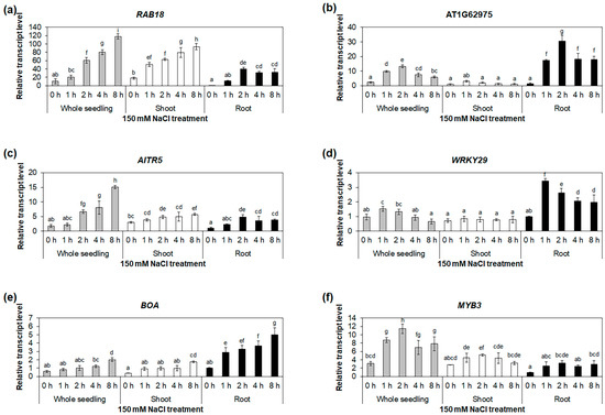 Expression analysis of salt-stress-responsive transcription-factor genes. Quantitative RT-PCR analyses of RAB18 (a), AT1G62975 (b), AITR5 (c), WRKY29 (d), BOA (e), and MYB3 (f) in whole seedlings, shoots, and roots under 150 mM NaCl treatment for 0, 1, 2, 4, and 8 h. The GAPc was used as an internal control. Transcript levels at 0 h in roots were set as 1. Three biological replicates were performed, with two technical replicates for each biological replicate. Three independent reactions were performed for each technical replicate. Error bars represent standard deviation (n = 6 reactions). Different letters indicate statistically significant differences (p < 0.05).