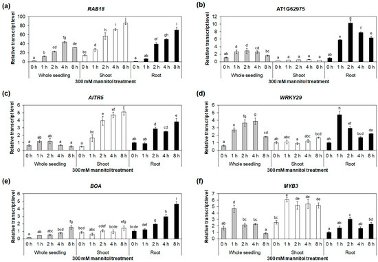 Expression analysis of drought-stress-responsive transcription-factor genes. Quantitative RT-PCR analysis of RAB18 (a), AT1G62975 (b), AITR5 (c), WRKY29 (d), BOA (e), and MYB3 (f) in whole seedlings, shoots, and roots under 300 mM mannitol treatment for 0, 1, 2, 4, and 8 h. The GAPc was used as an internal control. Transcript levels at 0 h in roots were set as 1. Two biological replicates were performed with two technical replicates for each biological replicate. Three independent reactions were performed for each technical replicate. Error bars represent standard deviation (n = 4 reactions). Different letters indicate statistically significant differences (p < 0.05).