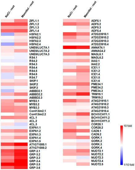 - Jiang, Y.; Deyholos, M.K. Comprehensive transcriptional profiling of NaCl-stressed Arabidopsis roots reveals novel classes of responsive genes. BMC Plant Biol. 2006, 6, 25. [Google Scholar] [CrossRef]