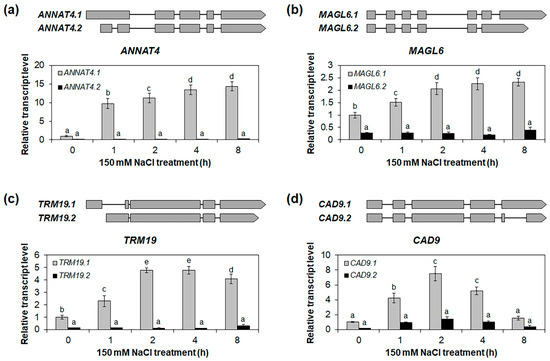Expression analysis of salt-stress-responsive alternative splice variants in roots. Quantitative RT-PCR analysis of alternative splice variants of ANNAT4 (a), MAGL6 (b), TRM19 (c), and CAD9 (d) in roots under 150 mM NaCl treatment for 0, 1, 2, 4, and 8 h. The GAPc was used as an internal control. The relative transcript levels were determined with respect to the transcript level of isoform 1 at 0 h. Isoform 1 of each gene was indicated as the representative isoform on TAIR website (TAIR, https://www.arabidopsis.org, accessed on 22 June 2023). Three biological replicates were performed, with two technical replicates for each biological replicate. Three independent reactions were performed for each technical replicate. Error bars represent standard deviation (n = 6 reactions). Different letters indicate statistically significant differences (p < 0.05).