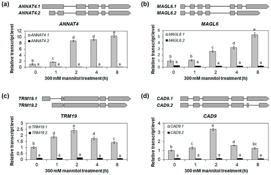Expression analysis of drought-stress-responsive alternative splice variants in roots. Quantitative RT-PCR analysis of alternative splice variants of ANNAT4 (a), MAGL6 (b), TRM19 (c), and CAD9 (d) in roots under 300 mM mannitol treatment for 0, 1, 2, 4, and 8 h. The GAPc was used as an internal control. The relative transcript levels were determined with respect to the transcript level of isoform 1 at 0 h. Isoform 1 of each gene was indicated as the representative isoform on TAIR website (TAIR, https://www.arabidopsis.org, accessed on 22 June 2023). Two biological replicates were performed, with two technical replicates for each biological replicate. Three independent reactions were performed for each technical replicate. Error bars represent standard deviation (n = 4 reactions). Different letters indicate statistically significant differences (p < 0.05).