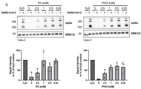 PC and PHCl treatment results in inhibition of SARS-CoV-2 replication at non-toxic concentrations in vitro. (a) Calu-3 cells were treated with the indicated concentrations of PC, PHCl or solvent (H2O) for 24 h, after which cell viability was determined via MTT assay. Values are given in percent of the solvent-treated control. Statistical significance was determined using one-sample t-tests comparing all means to 100%: * p < 0.05; ** p < 0.01. (b) Calu-3 cells were infected with 0.5 MOI of the SARS-CoV-2 variants (early variant B1.1 or delta variant AY.126) in the presence of PC, PHCl or H2O for 2 h. The inhibitor or solvent was again added after a washing step, and viral titres in the supernatant were determined via plaque assay at 24 h post infection (p.i.). The virus titres of solvent-treated infected cells were arbitrarily set to 100%. The means (±SD) of three independent experiments including two biological samples are shown. EC50 values were calculated using a 4-parameter nonlinear least squares fit in GraphPad Prism. (c) Calu-3 cells were pre-incubated with the indicated concentrations of PC or PHCl for 30 min prior to infection with 0.5 MOI of SARS-CoV-2 B1.1 variant. The cells were treated with the inhibitors during infection and again after a media change 2 h p.i. The cells were lysed 24 h p.i. and used for SDS-PAGE and Western blot analysis. Representative images of three independent experiments are depicted. Spike protein expression relative to the loading control was quantified using ImageJ.