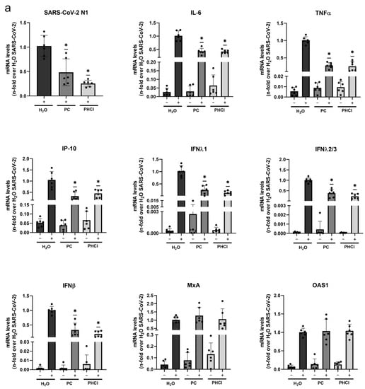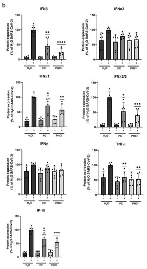 PC and PHCl treatment cause a reduction in SARS-CoV-2-induced IFN and cytokine levels. Calu-3 cells were pre-treated with 2.5 mM PC or PHCl or solvent control for 30 min prior to infection and then infected with 0.5 MOI of the early SARS-CoV-2 variant for 2 h in the presence of the inhibitor. The inhibitor was again added after a medium change, and the cells were further incubated to 24 h p.i. (a) RNA was extracted, and the replication of SARS-CoV-2 (detecting the N1 region) as well as the transcription of the indicated cytokines and chemokines was quantified via qRT-PCR. Solvent-treated infected samples were arbitrarily set to 1. The mean (+SD) of three independent experiments with biological duplicates is depicted (black dots represent individual values). Statistical significance was determined using one-sample Wilcoxon test and compared to 1; * p < 0.05. (b) The amount of the indicated cytokines in the supernatants was determined using flow cytometry. The mean (+SD) of three independent experiments with biological duplicates is depicted. Solvent-treated infected samples were arbitrarily set to 100%. Statistical significance was determined using one-sample t-test and compared to 100%: * p < 0.05; ** p < 0.01; *** p < 0.001; **** p < 0.0001.