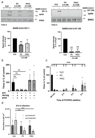 PC and PHCl treatment resulted in reduced SARS-CoV-2 progeny virus production at a late stage of the replication cycle. (a) Calu-3 cells were infected with 3 MOI of early SARS-CoV-2 variant or delta variant or were left uninfected in the presence of 2.5 mM PC or PHCl or solvent-treated for 2 h. The medium was replaced, and the cells were further incubated with PC, PHCl or solvent until 8 h p.i., after which cells were lysed and the spike protein content was analysed via SDS-PAGE and Western blot. A representative example of three independent experiments is depicted (top row). Quantification of three independent experiments using ERK2 as loading control was performed using Image J (bottom row). The signal intensity of the solvent-treated samples was arbitrarily set to 100%. Statistical significance was determined using one-sample t-test and compared to 100%; ** p < 0.01. (b,c) Calu-3 cells were treated with 2.5 mM PC (b,c) or PHCl (c) or solvent control as indicated 30 min prior to infection with 3 MOI SARS-CoV-2 B1.1 variant. The cells were again inhibitor- or solvent-treated as indicated during infection. The medium was changed 2 h p.i. and the inhibitor or solvent was added again at the indicated times post infection without removing the media again. Viral titres in the supernatants 8 h (b) or 12 h (c) p.i. were determined via plaque assay. The mean (+SD) of three independent experiments with biological duplicates is shown. Titres of the solvent-treated samples were arbitrarily set to 100%. Statistical significance was determined using matched ANOVA with Dunette’s multiple comparisons test (b) or ordinary two-way ANOVA (c). ** p < 0.01; *** p < 0.001. (d) Calu-3 cells were infected with 3 MOI SARS-CoV-2 B1.1 variant for 2 h, after which cells were washed with PBS and the medium was replaced without adding inhibitor. The supernatant was collected 9 h p.i. and replaced with new medium containing 2.5 mM PC or PHCl or solvent. Supernatants were collected at 12 h p.i., and viral titres in all samples were determined via plaque assay. The mean + SD of three independent experiments is shown. Statistical significance was determined via ordinary one-way ANOVA with Dunette’s multiple comparisons test. ** p < 0.01; *** p < 0.001.