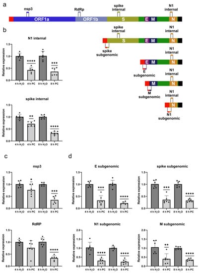 Treatment with PC limits synthesis of subgenomic viral RNAs prior to inhibiting synthesis of whole genome copies. (a) Schematic representation of the SARS-CoV-2 genome and the employed primer pairs. (b–d) Calu-3 cells were infected with 3 MOI of the early SARS-CoV-2 variant for 2 h. The medium was then replaced with new medium containing 2.5 mM PC. The cells were lysed for RNA extraction 4 h and 8 h p.i., and the relative levels of viral RNA were determined via qRT-PCR using primers amplifying (b) a structural protein gene region, (c) a non-structural protein gene region or (d) a region of subgenomic RNA specifically. The mean (+SD) of three independent experiments with biological and technical duplicates is shown. Expression levels of solvent-treated samples were arbitrarily set to 1. Statistical significance was determined via one-sample t-test and compared to 1: * p < 0.05; ** p < 0.01; *** p < 0.001; **** p < 0.0001.