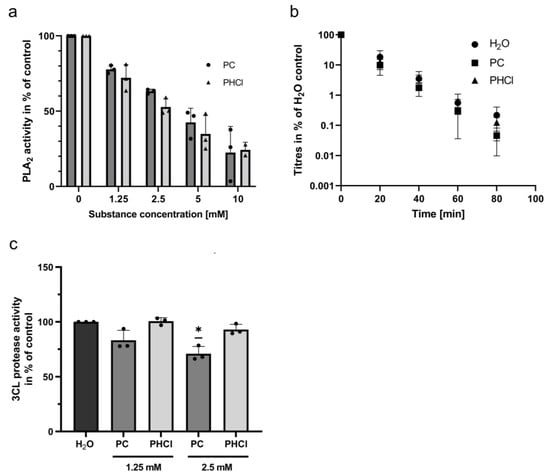 The activity of phospholipase A2 (PLA2) from Calu-3 cells is reduced in the presence of PC or PHCl. (a) Samples containing PLA2 were generated by lysing Calu-3 cells in distilled water. The activity of PLA2 in the presence of the indicated concentrations of PC or PHCl was measured using a fluorescent substrate (excitation: 485 nm; emission: 520 nm). PLA2 activity of the control sample was arbitrarily set to 100%. The mean + SD of three independent PLA2 samples with technical duplicates per treatment are shown. (b) Calu-3 cells were infected with 0.5 MOI of SARS-CoV-2 (early variant) for 2 h, after which cells were washed and incubated in new medium containing 2.5 mM PC or PHCl for 24 h. Titres were determined via plaque assay and then equalised in all samples. Samples were subjected to heat treatment at 50 °C for the indicated times, after which titres were again determined via plaque assay. Titres at 0 min were arbitrarily set to 100%. The mean ± SD of three independent experiments with biological duplicates is depicted. (c) The activity of SARS-CoV-2 3CL protease in the presence of the indicated concentrations of PC and PHCl was measured using a fluorescent substrate (excitation: 355 nm; emission: 460 nm). Activity in the control samples was arbitrarily set to 100%. The mean + SD of three independent measurements with technical duplicates is shown. Statistical significance was determined via one-sample t-test and compared to 100%; * p < 0.05.