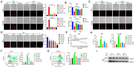 Arginine deprivation inhibits erastin-induced ferroptosis, but not RSL3-induced ferroptosis. (A–C) MEF and HT1080 cells were cultured in the complete medium for 20 h, and then treated with erastin (2.5 µM) for 6 h and 9 h, respectively or RSL3 (1 µM) for 4 h in the complete medium (with 847 µM arginine) or arginine-depleted medium, with or without Fer (Ferrostatin-1, 10 µM). Cell death was analyzed by PI staining followed by microscopy imaging (A,C) and flow cytometry analysis (A). Scale bar, 100 µm. Cell viability was analyzed by CCK-8 (B). (D,E) MEF cells were treated with erastin (2.5 µM) in the arginine-depleted medium supplemented with the indicated dose of arginine (0, 50, 100, 200, 400, 847 µM) for 6 h. Cell death was analyzed by PI staining followed by microscopy imaging and flow cytometry analysis (D). Scale bar, 100 µm. Cell viability was analyzed by CCK-8 (E). (F–H) Lipid ROS (F,G) and total ROS (H) were analyzed by flow cytometry analysis. Representative histograms of flow cytometry and the relative mean fluorescence intensity are shown. (I) MEF cells were treated with 2.5 µM erastin (0, 2.5, 4.5 h) in the complete or arginine-depleted medium, and then the GPX4 expression was determined. All data represent the mean ± SEM from three independent experiments. * p < 0.05, ** p < 0.01, *** p < 0.001. +Arg: complete medium, −Arg: arginine-depleted medium, Era: erastin, Fer: Ferrostatin-1.