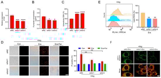 As above-mentioned, fumarate is an important metabolite that is derived from several metabolic pathways including urea cycle, purine metabolism, TTP (tyrosine, tryptophan and phenylalanine) metabolism, and tricarboxylic acid cycle [33]. Among them, the urea cycle can be sustained by arginine. In addition, ASL is the key and direct enzyme to generate fumarate by catalyzing argininosuccinate [34]. To test whether ASL is involved in fumarate biosynthesis and ferroptosis regulation, we knocked down Asl by the transfection of siRNA. siRNA-Asl (siAsl-1, siAsl-2) could significantly reduce the mRNA level of Asl, as evidenced by the RT-qPCR assay (Figure 4A). In this context, we found that knockdown of Asl in cells cultured in the complete medium led to a notable reduction in intracellular fumarate, as detected by HPLC (Figure 4B). Importantly, the GSH level was elevated in cells maintained in the complete medium when Asl was knocked down (Figure 4C). In addition, the transfection of siAsl-1 and siAsl-2 effectively inhibited the erastin-induced ferroptosis in the presence of arginine, as shown by the PI staining (Figure 4D). Furthermore, both the flow cytometry analysis and confocal microscope imaging revealed that arginine failed to facilitate erastin-induced lipid ROS when Asl was knocked down (Figure 4E,F). These results demonstrate that the knockdown of Asl decreases fumarate and desensitizes cells to erastin-induced ferroptosis in the presence of arginine.