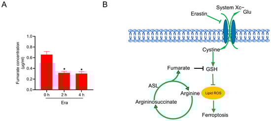 Fumarate is decreased in response to erastin exposure. (A) MEF cells were treated with erastin (2.5 µM) in the complete medium. Fumarate was measured by HPLC. (B) The summary diagram shows that arginine facilitates erastin-induced ferroptosis through its metabolite fumarate in the urea cycle. Fumarate exhausts GSH by covalently binding to GSH. In response to erastin challenge, fumarate is significantly decreased, suggesting that a protective defense exists to decelerate GSH exhaustion in response to pro-ferroptotic stimuli. All data represent the mean ± SEM from three independent experiments. * p < 0.05. Era: erastin.