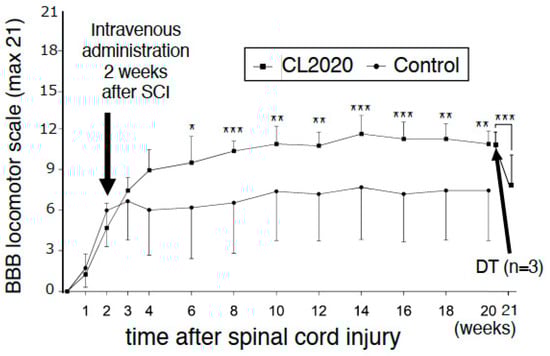 Basso, Beattie, and Bresnahan (BBB) locomotor scores. The open-field locomotor hindlimb function of all rats was tested on the day after injury and weekly thereafter for 20 weeks. CL2020 was intravenously administered two weeks after the injury. Results are shown separately for the CL2020 (line with square markers, n = 8) and Control groups (line with circle markers, n = 12). Six weeks after the injury, BBB scores were significantly higher in the CL2020 group than in the Control group. In three animals from the CL2020 group, diphtheria toxin (DT) was administered to revert engrafted cell functions. In the CL2020 group, BBB scores significantly decreased 5 days after the administration of DT. *: p < 0.05, **: p < 0.01, ***: p < 0.001.