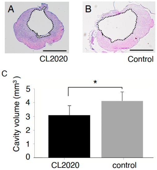 Measurements of the cystic cavity. Representative spinal cord axial sections in the lesion center of the CL2020 (A) and Control groups (B) in HE staining. Dotted lines indicate cavity areas in sections. The volumes of the cystic cavity were calculated as described in the Materials and Methods section. Scale bars = 1000 µm. (C) A graph showing cystic cavity volumes in the CL2020 (black) and control (gray) groups. Cavities were significantly smaller in the CL2020 group (*: p < 0.05).