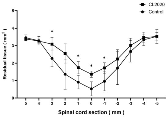 Areas of spared spinal cord tissue in relation to the lesion epicenter. Results are shown separately for the CL2020 (line with circle markers, n = 5) and Control groups (line with circle markers, n = 5). Twenty weeks after the injury, larger areas of the spinal cord were preserved in the CL2020 group than in the control group. *: p < 0.05.