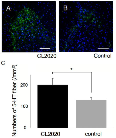 Fluorescent staining of an anti-5-HT antibody (ab66047, Abcam, Cambridge, UK) was used to evaluate preserved 5-HT fibers in the spinal cord. The number of 5-HT-immunolabeled axons 3 mm caudal to the epicenter of the injury was quantified with ImageJ (Rasband, W.S., ImageJ, U. S. National Institutes of Health, Bethesda, MD, USA) in a section perpendicular to the rostral–caudal axis of the spinal cord. The number of positive fibers was counted in three different high-magnification images from every fifth section. The number of positive fibers was calculated in a given area of 1 square millimeter during microscopic analysis. Preserved 5-HT fibers in the 5 animals in CL2020 and 7 animals in Control groups were compared using the Mann–Whitney U test.