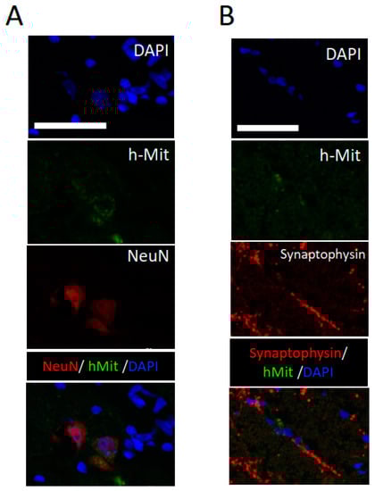 Additionally, in the gray matter close to the lesion center, positive NeuN staining was recognized in hMit-positive cells. In the same area, synaptophysin positivity was noted in close relation to the hMit positive cells. These data support the neuronal differentiation of the engrafted cells (Figure 6).