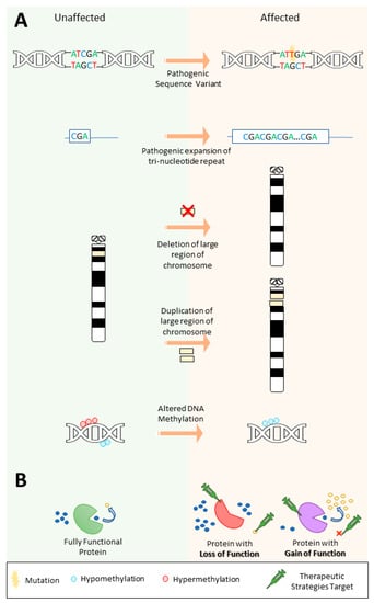 Types of genetic variants that contribute to epilepsy and potential targets for therapeutic strategies depending on the effect of the pathogenic variant. (A) Different pathogenic variants can cause epilepsy, including (i) sequence variants, (ii) expansion repeat variants, (iii) copy-number variants, and (iv) epigenetic variation, such as altered DNA methylation. Note that copy-number variants can also include gene or intra-gene level changes. Also, different types of variants can also act together, for instance, a repeat expansion may cause increased hypermethylation of a gene promoter leading to its inactivation. (B) The effect a variant has on downstream pathways can lead to either a loss or gain of function and therapeutic strategies can target the affected protein as well as substrates or downstream products in the pathway depending on the effect of the variant.