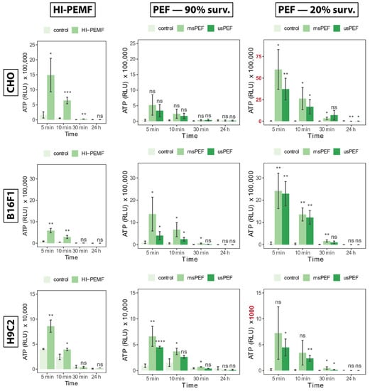 The release of ATP into the extracellular space 5, 10, 30 min and 24 h after HI-PEMF and PEF treatment in different cell lines. Asterisks *, **, ***, **** denote the statistical difference between the treated sample and the corresponding untreated control with a p-value of less than 0.05, 0.01, 0.005 and 0.001, respectively. Acronym “ns” denotes no statistical difference between the treated sample and the corresponding untreated control (p > 0.05). The mean ± standard deviation is given for each treatment. Note different scale ranges (colored red) in the release of ATP at PEF 20% survival in CHO and H9c2 cell lines.