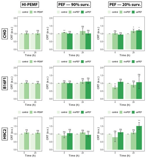 Externalization of calreticulin 4 and 24 h after HI-PEMF and PEF treatment on different cell lines. Asterisks *, ** denote the statistical difference between the treated sample and the corresponding untreated control with a p-value of less than 0.05 and 0.01, respectively. Acronym “ns” denotes no statistical difference between the treated sample and the corresponding untreated control (p > 0.05). The mean ± standard deviation is given for each treatment.