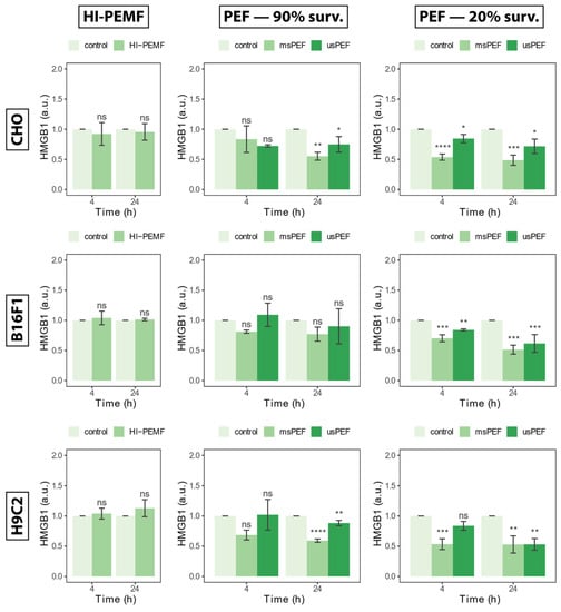 The release of HMGB1 in extracellular space 4 and 24 h after HI-PEMF and PEF treatment on different cell lines. Asterisks *, **, ***, **** denote the statistical difference between the treated sample and the corresponding untreated control with a p-value of less than 0.05, 0.01, 0.005, 0.001, respectively. Acronym “ns” denotes no statistical difference between the treated sample and the corresponding untreated control (p > 0.05). The mean ± standard deviation is given for each treatment.
