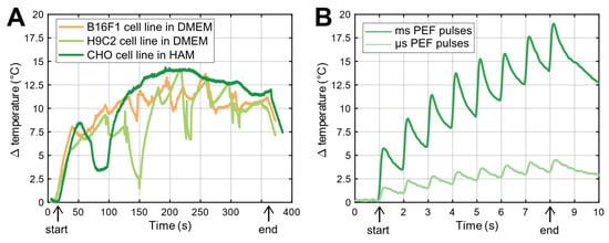 Figure 4 shows the temperature change of the cell suspensions during the delivery of HI-PEMF (Figure 4A) and the PEF treatment (Figure 4B). The start and end of the delivery are marked “start” and “end”, respectively, in Figure 4. Since a different number of pulses was delivered at the same repetition frequency of 1 Hz, namely 350 in the case of HI-PEMF and 8 in the case of PEF treatment, the suspensions were exposed to Joule heating for different durations, namely 350 s in the case of HI-PEMF and 8 s in the case of PEF treatment. The temperature change remained below 15 °C and 19 °C during the HI-PEMF and PEF treatment, respectively. The thermal effects on cells should be negligible, since the highest absolute temperature of the cell suspension during the application of HI- PEMF and both PEF treatments did not rise above the critical temperature of 43 °C, i.e., the threshold for thermal damage [].