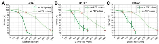 Survival curves obtained by applying µsPEF and msPEF treatment for CHO (A), B16F1 (B) and H9C2 (C) cell lines. Experimental points for DAMP analysis were determined based on survival curves, where the curves intersected at 90% (red circle) and 20% survival (red diamond).