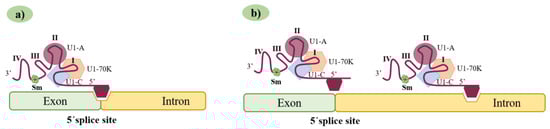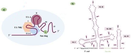 The U1 snRNP is one of the 5 snRNPs that constitute the spliceosome. This molecule is essential for the splicing process, and previous studies have shown that it is produced in larger quantities than any other snRNP, demonstrating its relevance. Mammalian U1 snRNP is comprised of a 164-nucleotide U1 snRNA, 7 Sm proteins (B or B’, D1, D2, D3, E, F, and G), which are shared with other snRNPs, and 3 U1-specific proteins (U1-A, U1-C, and U1-70K) (Figure 1a) [,,].