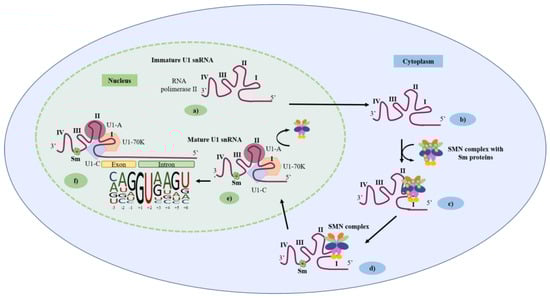U1 small nuclear RNA (U1 snRNA) processing. The pre-U1 snRNA is transcribed in the nucleus by RNA polymerase II (a) and transported to the cytoplasm (b), where the formation of the Sm protein ring occurs (c,d). At this stage, however, the U1 snRNA is still immature. Then, the U1 snRNA returns to the nucleus, where the binding to the proteins U1-A, U1-70K and U1-C occurs and the U1 snRNA becomes mature (e). Finally, the mature U1 small nuclear ribonucleoprotein (U1 snRNP) initiates the spliceosome assembly through the binding to the pre-mRNA 5′ splice-site (9 nucleotides, CAG/GURAGU conserved between exons-introns) (f).