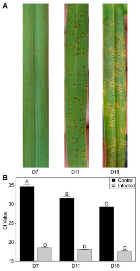 Pustules were well differentiated by 11 DAI, and leaf damage was visible by 18 DAI (Figure 1A). Detection of fungal DNA loads was performed with qPCR and indicated little change in apparent fungal load between 7 and 18 DAI (Figure 1B). Some limited secondary infection of control plants was observed between 7 and 18 DAI, although the detected fungal loads in control plants were significantly lower in comparison to the infected plants. These infections likely arose from the proximity of plants within the greenhouse.