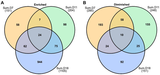 Venn diagram of enriched and diminished differentially abundant proteins (DAPs). (A) Shared and unique DAPs found in rust-infected Summer plants at 7, 11, and 18 DAI. (B) Shared and unique DDAPs found at 7, 11, and 18 DAI in Summer plants. See text for more details.