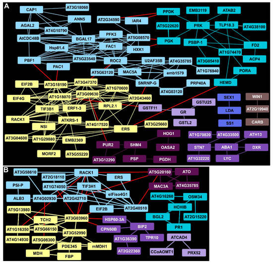 STRING analysis of DAPs in rust-infected Summer plants 7 DAI. (A) Clusters and connectivity of EDAPs. (B) Clusters and connectivity of DDAPs. Clusters containing Arabidopsis proteins with known interactions in databases are in boxes of the same color. Red lines indicate potential association with other clusters. Arabidopsis functional protein annotations are from the NCBI database. Switchgrass orthologs of Arabidopsis proteins are given in Supplementary Materials.