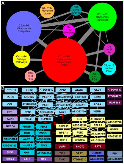 Six other clusters containing eleven to sixteen proteins were found during STRING analysis (Figure 5A). These included C6 (light blue) that contained several proteins, such as EMB2766, NUP1, and IMPA-1, linked to nuclear pores and transport across the nuclear membranes in Arabidopsis (Supplementary Materials). Cluster C7 (pink, Figure 5A) contained several proteins linked to shikimate and amino acid metabolism, including SKL1, SKL2, and a 3-hydroquinate synthase ortholog. A phospho-2-dehydro-3-deoxyheptonate aldolase and ADT2 needed for aromatic amino acid metabolism were also part of C7. Protein signatures for ER stress and changes in plastid metabolism were found in C8 (dark green, Figure 5A, Supplementary Materials). These included protein disulfide isomerases associated with ER stress (PDIL1-1, PDIL2-1, UNE5), heat shock proteins (BIP2, HSP60), and other protein chaperones (AT1G36390, CRT3), indicating a possible need to refold unfolded proteins and to combat stress. Clusters C9 (purple), C10 (salmon pink) and C11 (slate) contained proteins linked to ubiquitin ligases, those needed for sulfur and Fe-S metabolism, and arginine/polyamine metabolism, respectively (Supplementary Materials).
