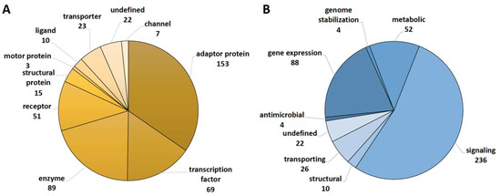 Main roles of vitamin D targets. The databases Human Protein Atlas and GeneCards were used to classify 442 vitamin D target genes identified in the VitDHiD study (Table S1) according to the type of protein that they encode (A) and their main biological function (B).