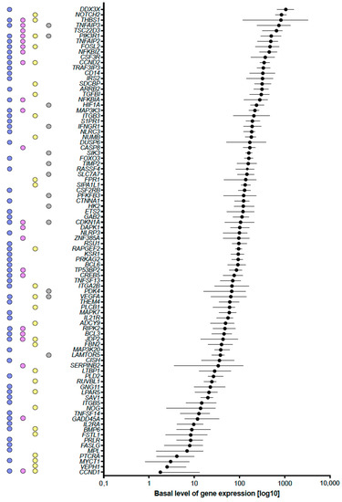 Range of basal expression of vitamin D target genes involved in signal transduction pathways. Colored dots indicate the association of the genes with the four different categories of signal transduction pathways (see Figure 2). Mean basal gene expression (log scale) for the 25 individuals is indicated by black dots, and the range is indicated by horizonal lines.