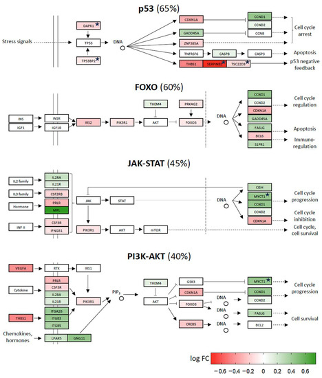 Vitamin D-triggered homeostasis. The signal transduction pathways p53, FOXO, JAK-STAT and PI3K-STAT have approximately equal numbers of protein components, the genes of which are upregulated (green) and downregulated (red) by vitamin D supplementation in healthy individuals. In each pathway the given percentage reflects the number of genes, the direction of regulation of which will contribute to signal inhibition. The color intensity is proportional to the log fold change (FC) of gene expression between d1 and d0. The structure of the pathway follows the design of KEGG. Functionally similar proteins not indicated in KEGG are marked by an asterisk.