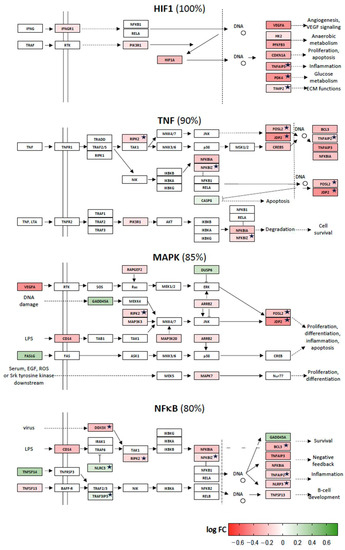 The other eight signaling pathways have 75% or more of their vitamin D target genes downregulated. These are the signal transduction cascades named for the proteins HIF1, TNF, MAPKs and NFκB (Figure 5), as well as those named for VEGF (vascular endothelial growth factor), TGFβ (tumor growth factor β), RAS (rat sarcoma virus) and TOR (target of rapamycin) (Figure S2).