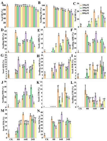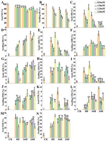 The colchicine-treated seed germination percentage ranged from 90.8% to 80.5% across all respective seed-soaked treatments (Figure 8C). In contrast, no colchicine treatment showed a non-significant effect versus CK; therefore, colchicine proved its more toxic effects on seed germination.