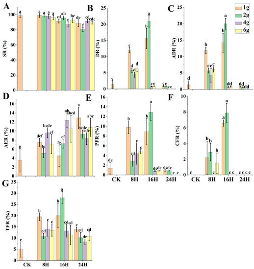Caffeine–Taurine (CAF–T) seed-soaking method efficacy. (A) Seed SR (survival rate), (B) Seed DR (doubling rate), (C) Seed ADR (actual doubling rate), (D) Seed AER (anthers emergence rate), (E) Seed PFR (partial fertility rate), (F) Seed CFR (complete fertility rate), (G) Seed TFR (total fertility rate). CK = control; this treatment is identical to all other treatments, but distilled deionized water (ddH2O) replaced CAF–T and Di-methyl Sulfoxide (DMSO) solution. Different small letters on bars represent the significant differences within the treatments calculated using Tukey’s HSD test at p ≤ 0.05. Vertical bars on graphs indicate the standard deviation of the mean (n = 3).