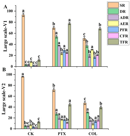 Large-scale efficacy comparison between Paclitaxel (PTX) versus colchicine (COL) of two maize genotypes. (A) V1 and (B) V2. SR (survival rate), DR (doubling rate), ADR (actual doubling rate), AER (anthers emergence rate), PFR (partial fertility rate), CFR (complete fertility rate), and TFR (total fertility rate). CK = control; this treatment is identical to all other treatments, but distilled deionized water (ddH2O) replaced PTX, colchicine, tween-80, and Di-methyl Sulfoxide (DMSO) solution. Different small letters on bars represent the significant differences within the treatments calculated using Tukey’s HSD test at p ≤ 0.05. Vertical bars on graphs indicate the standard error of the mean (n = 3).