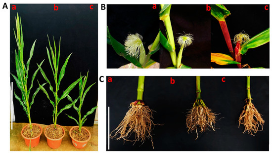 Comparative impact of paclitaxel (PTX) versus colchicine on the morphology of haploid maize plants. (A) Impact on plant and ear height; Scale = 85 cm. (a) CK (control), (b) PTX, (c) Colchicine. (B) Impact on silks number/ear (a) CK, (b) PTX, (c) Colchicine. (C) Root Growth (a) CK, (b) PTX, (c) colchicine; scale = 15 cm.