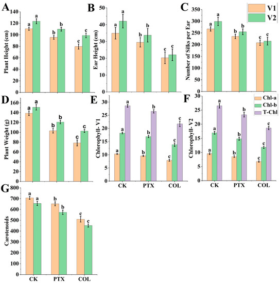 Comparative impact of paclitaxel (PTX) versus colchicine on morphology and physiology of haploid maize plants. (A) Plant height, (B) Ear height, (C) Number of silks/ears, (D) Plant weight, (E) Chlorophyll a (Chla), Chlorophyll b (Chlb), and total chlorophyll (ChlT)—variety 1 (V1), (F) Chla, Chlb and ChlT—variety 2 (V2), (G) Carotenoid contents. COL = colchicine; CK = control; this treatment is identical to all other treatments, but distilled deionized water (ddH2O) replaced PTX, colchicine, tween-80, and Di-methyl Sulfoxide (DMSO) solution. Different small letters on bars represent the significant differences within the treatments calculated using Tukey’s HSD test at p ≤ 0.05. Vertical bars on graphs indicate the standard error of the mean (n = 3 or n = 4).