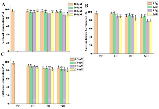 Comparative impact of paclitaxel (PTX), caffeine–taurine (CAF–T), and colchicine on seed germination with different concentrations and treatment time. (A) PTX impact on seed germination; (B) CAF–T impact on seed germination; (C) Colchicine impact on seed germination. CK = control; this treatment is identical to all other treatments, but distilled deionized water (ddH2O) replaced PTX, colchicine, tween-80, and di-methyl Sulfoxide (DMSO) solution. Different small letters on bars represent the significant differences within the treatments calculated using Tukey’s HSD test at p ≤ 0.05. Vertical bars on graphs indicate the standard error of the mean (n = 3 or n = 4).