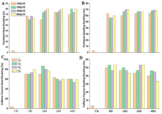 Confirmation of chromosome-doubling ratio (DR) under microscope induced by paclitaxel (PTX) and caffeine–taurine (CAF–T). (A) PTX-treated seeds; (B) PTX-treated seedlings (roots only); (C) CAF–T-treated seeds; (D) CAF–T-treated seedlings (roots only). CK = control; this treatment is identical to all other treatments, but distilled deionized water (ddH2O) replaced PTX, colchicine, tween-80, and Di-methyl Sulfoxide (DMSO) solution.