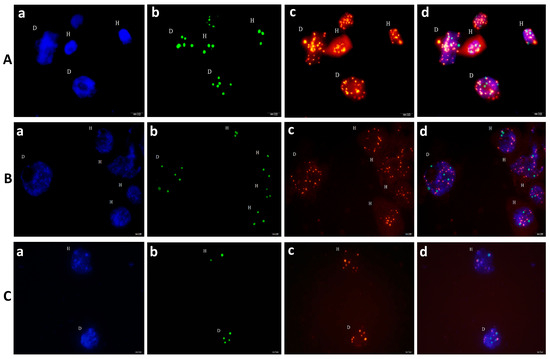 Fluorescence in situ hybridization (FISH) using knob-2 probe to detect chromosomal doubling signals induced by paclitaxel (PTX) and caffeine–taurine (CAF–T). (A) PTX-induced chromosomes doubled in the treated seed; (B) PTX-induced chromosomes doubled in treated seedling (roots only); (C) CAF–T-induced chromosomes doubled in the treated seed; (D) Diploid cells; (H) Haploid cells; (a) DAPI (4’,6-diamidino-2-phenylindole) (Vector) (blue); (b) Knob-2 (green); (c) Gypsy (red); (d) Merger of a, b, and c.