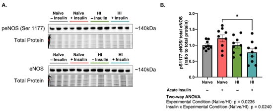 Upon insulin stimulation, nitric oxide (NO) production in endothelial cells is mediated by the phosphatidylinositol-3-kinase/protein kinase B (PI3K/AKT) pathway [30]. We previously showed that this pathway is downregulated in hyperinsulinemic primary mouse brain endothelial cells (MBECs) [29]. Given the importance of NO in insulin-mediated vasoregulation, we first sought to assess NO production capacity in MBECs (n = 9, N = 2). Endothelial nitric oxide synthase (eNOS), the enzyme responsible for NO generation, becomes activated by the insulin/PI3K/AKT axis via phosphorylation of the serine 1177 residue (peNOSS1177) [30]. peNOSS1177/eNOS levels were significantly affected by experimental condition (naïve v. hyperinsulinemic) (p = 0.0236, F (1, 32) = 5.653). Acute insulin stimulation greatly reduced the amount of peNOSS1177/eNOS in hyperinsulinemic MBECs as compared to naïve (p = 0.0105, 44.50% difference; Figure 1A,B). These data support that hyperinsulinemia impairs NO production capability in MBECs.