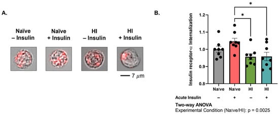 We previously reported that hyperinsulinemia alters insulin receptor presentation and reduces downstream insulin signaling in MBECs. Interestingly, we observed an increase in both total and membrane-bound insulin receptor levels in MBECs prior to acute insulin stimulation [29]. As insulin signaling is tightly linked to internalization, we aimed to directly compare insulin receptor internalization in naïve and hyperinsulinemic MBECs with and without acute insulin stimulation (n = 8, N = 2). A two-way Analysis of Variance (ANOVA) revealed a significant effect of experimental condition on internalization (p = 0.0025, F (1, 28) = 10.98). Importantly, Tukey’s Honest Significant Difference (HSD) post hoc comparison identified that acute insulin stimulation significantly reduced internalization in hyperinsulinemic MBECs as compared to naïve cells (p = 0.0199, 8.7% difference; Figure 2A,B). These results confirm that acute insulin stimulation impairs insulin receptor internalization following hyperinsulinemic conditioning.
