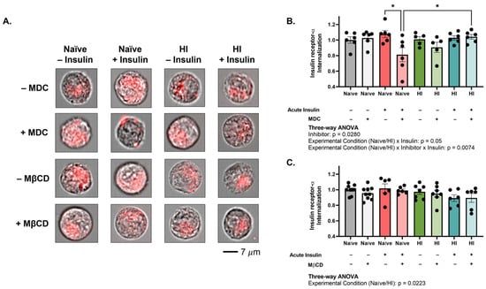 Insulin receptor can be internalized by both clathrin- or caveolin-dependent mechanisms on a tissue-specific basis [24,25,26]. To better contextualize the impact of hyperinsulinemia on internalization, we next sought to determine the mechanism by which the insulin receptor is internalized into MBECs (n = 5–6, N = 2). Blockade of clathrin-mediated endocytosis by monodansylcadaverine (MDC) significantly impaired insulin receptor internalization across experimental conditions and insulin treatments (interaction: p = 0.0074, F (1, 38) = 8.023), with the effect specifically observed in naïve MBECs following acute insulin stimulation (p = 0.0113, 28.13% difference; Figure 3A,B). Insulin receptor internalization was significantly affected only by experimental condition (p = 0.0223, F (1, 48) = 5.577) following inhibition of caveolin-mediated endocytosis by methyl-β-cyclodextrin (MβCD; Figure 3A,C), with no post hoc differences observed. These data suggest that the insulin receptor is internalized into healthy MBECs via a clathrin-mediated mechanism upon acute insulin stimulation. Unlike their naïve counterparts, insulin receptor internalization specifically into hyperinsulinemic MBECs, with and without acute insulin stimulation, was not significantly affected by MDC-mediated clathrin inhibition, nor MβCD-mediated caveolin inhibition (Figure 3A–C). Interestingly, there was a significant increase in internalization in MDC-treated hyperinsulinemic cells as compared to MDC-treated naïve cells following acute insulin stimulation (p = 0.0420, 24.86% difference; Figure 3A,B), suggesting that clathrin-mediated endocytosis is not utilized for insulin receptor internalization in conditions of hyperinsulinemia.