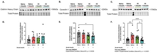 Acute insulin stimulation of hyperinsulinemic brain endothelial cells reduces early endosome availability without promoting significant changes in endocytic protein levels. (A–C) Western immunoblot images and (D–F) densitometric quantification of (A,D) clathrin heavy chain, (B,E) caveolin-1, and (C,F) early endosome antigen-1 (EEA1). All chemiluminescent signals were normalized to total protein depicted in the stain-free gel. Groups shown in representative images were run on the same gel/immunoblot, with colored lines above corresponding to groups displayed in bar graph. Data represented as mean ± standard error of the mean (SEM). Data normalized to naïve cells without acute insulin stimulation. Data analyzed via two-way Analysis of Variance (ANOVA) with Tukey’s Honest Significant Difference (HSD) post hoc comparison. * = p 0.05, ** = p 0.01, *** = p < 0.001. n = 8–12, N = 2. HI = hyperinsulinemic. L = protein ladder.
