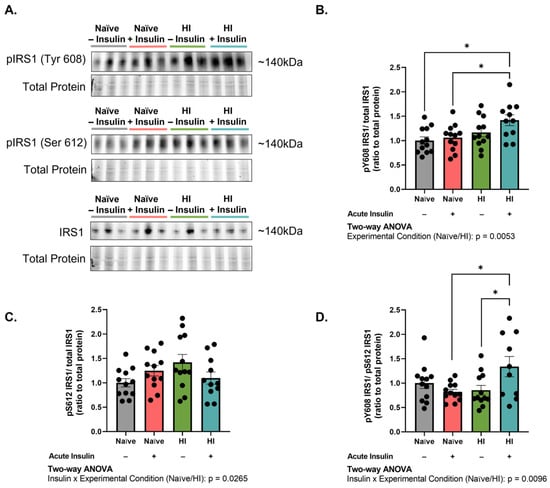 Balanced signaling through insulin receptor substrate 1 (IRS1) is crucial for clathrin-mediated endocytosis of the insulin receptor. Namely, concomitant dephosphorylation of IRS1 tyrosine 608 (pIRS1Y608; equivalent to human IRS1 tyrosine 612) and phosphorylation of IRS1 serine 612 (pIRS1S612; equivalent to human IRS1 serine 616) is important for proper recruitment of clathrin to the site [26]. Thus, we assessed the phosphorylation status of pIRS1Y608 and pIRS1S612 in MBECs (n = 10–12, N = 2). pIRS1Y608/IRS1 levels were significantly affected by experimental condition (p = 0.0053, F (1, 43) = 8.610). Post hoc testing identified that acute insulin stimulation increased pIRS1Y608/IRS1 levels in hyperinsulinemic as compared to naïve MBECs (p = 0.0377, 28.70% difference; Figure 5A,B). pIRS1S612/IRS1 levels were affected by experimental condition and insulin treatment (interaction p = 0.0265, F (1, 43) = 5.281) (Figure 5A,C). A significant interaction was also observed in the pIRS1Y608/pIRS1S612 ratio (p = 0.0096, F (1, 42) = 7.371). Acute insulin stimulation significantly increased the pIRS1Y608/pIRS1S612 ratio in hyperinsulinemic cells as compared to naïve (p = 0.0270, 48.04% difference; Figure 5D). These data support that acute insulin stimulation of hyperinsulinemic MBECs promotes aberrant phosphorylation of IRS1 residues involved in clathrin-mediated endocytosis.