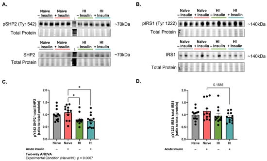 Hyperinsulinemia reduces Src homology phosphatase 2 (SHP2) activity. (A,B) Western immunoblot images and (C,D) densitometric quantification of (A,C) SHP2 phosphorylated at tyrosine 542 (pSHP2Y542) in relation to total SHP2 and (B,D) insulin receptor substrate 1 (IRS1) phosphorylated at tyrosine 1222 (pIRS1Y1222) in relation to total IRS1. All chemiluminescent signals were normalized to total protein depicted in the stain-free gel. Groups shown in representative images were run on the same gel/immunoblot, with colored lines above corresponding to groups displayed in bar graph. IRS1 representative image the same as in Figure 5. Data represented as mean standard error of the mean (SEM). Data normalized to naïve cells without acute insulin stimulation. Data analyzed via two-way Analysis of Variance (ANOVA) with Tukey’s Honest Significant Difference (HSD) post hoc comparison. * = p 0.05. n = 12, N = 2. HI = hyperinsulinemic. L = protein ladder.