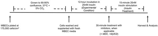 Primary C57BL/6 mouse brain microvascular endothelial cells (MBECs; C57-6023, Cell Biologics, Chicago, IL, USA) were cultured as per our previously established protocol [29]. In brief, MBECs were seeded at a density of 175,000 cells/cm2 into 12 well plates coated with gelatin-based coating solution (Cell Biologics). Cells were grown in complete mouse endothelial cell medium with supplement (Cell Biologics) to ~90–95% confluence at 37 °C and 5% CO2. Cells were incubated for 12 h overnight in 20 nM human recombinant insulin (Sigma, St. Louis, MO, USA) to induce basal hyperinsulinemia. Selection of incubation time and insulin concentration for hyperinsulinemic conditioning and acute insulin stimulation was dictated by pilot studies as previously described [29]. Acute insulin stimulation was subsequently performed, with protocol-specific indications described in the following sections. Figure 7 outlines culturing parameters and relevant terminology. All experiments were completed on passage 5. Human recombinant insulin was diluted directly into culture media.